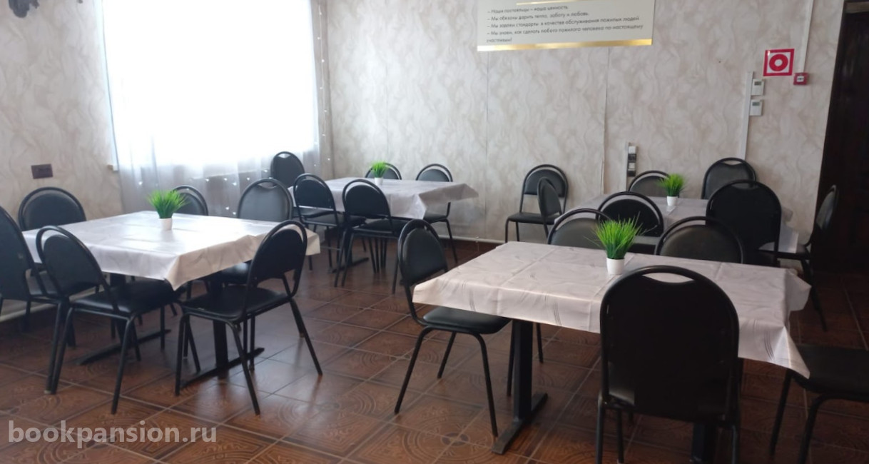 Питание организовано с учетом возрастных потребностей и медицинских показаний, возможна корректировка рациона (в том числе диетические столы, измельчение пищи, кормление с помощью персонала). Досуговая деятельность адаптирована для маломобильных и лежачих гостей: проводятся прослушивание музыки, аудиокниг, настольные игры с помощником, тематические беседы и просмотр передач.